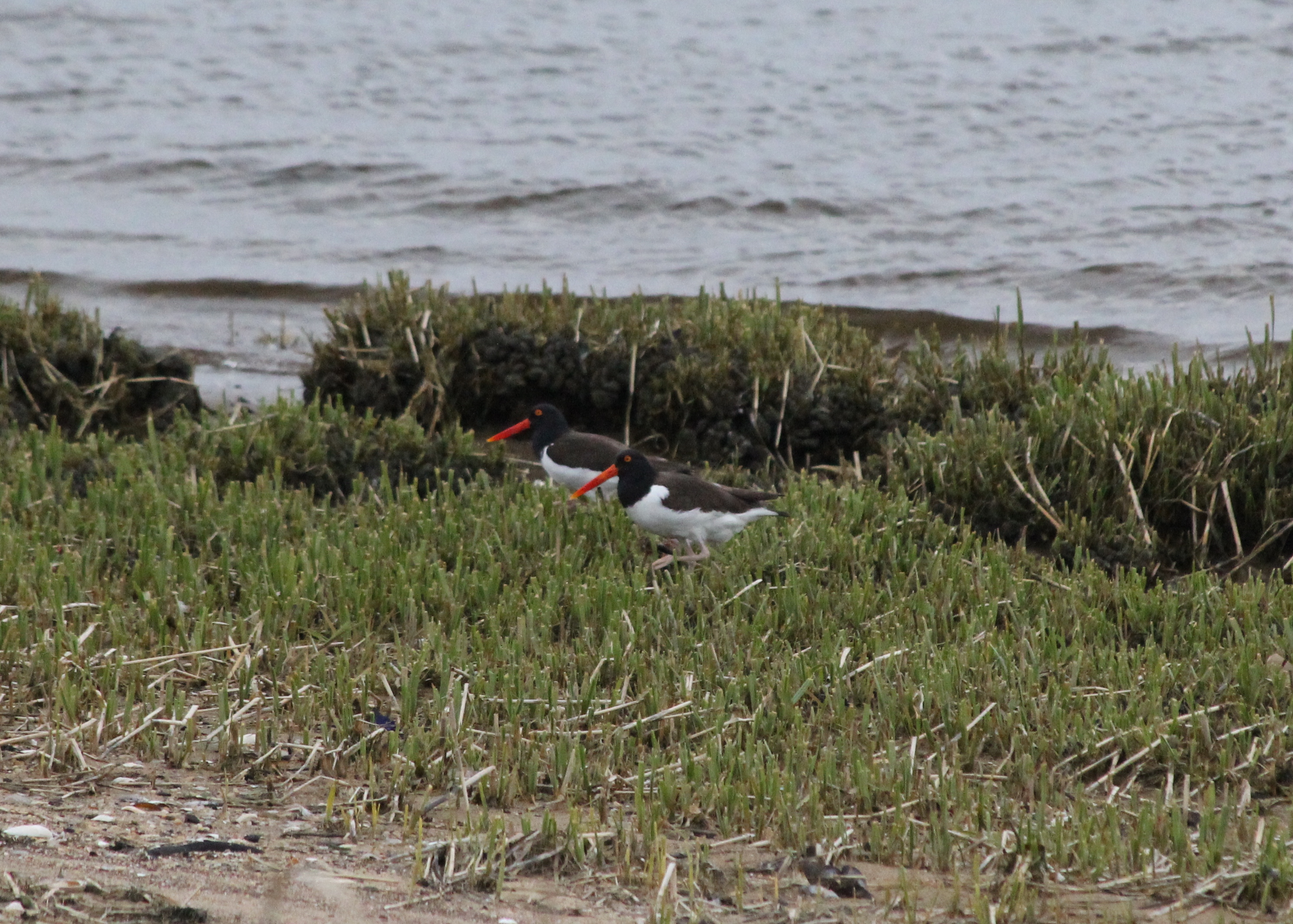 The Department of Sanitation stores a mountain of road salt near the entrance and the place is dotted with wells venting off the methane gas being brewed beneath the cap – not your typical introduction to an afternoon of birding.  It was around 5:30 in the evening and light was fading under cloud cover, making  photography difficult.  But Tim did manage to document a few of the avian fauna that call this place home, like this pair of American Oystercatchers: