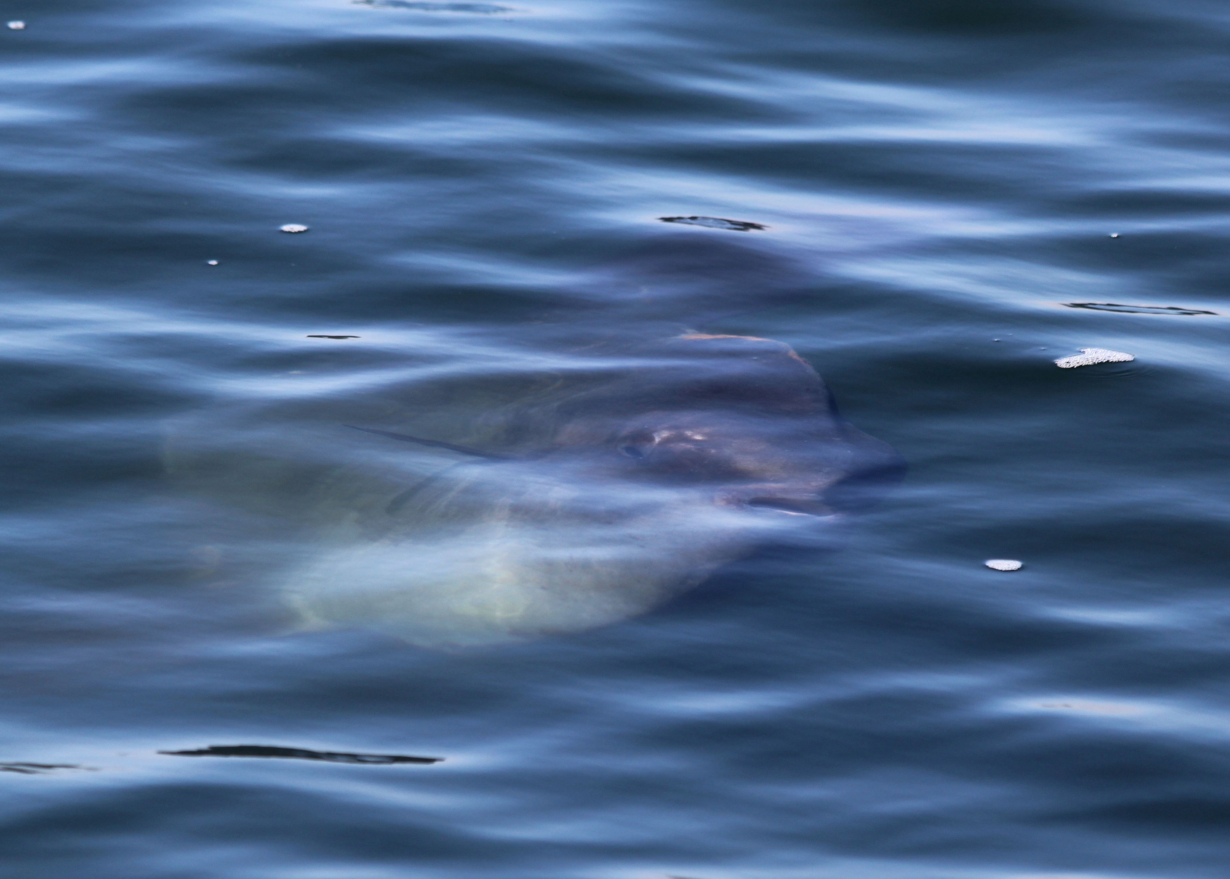 As we ventured northeast along the coast, the captain stopped the boat for what he thought was a harbor porpoise.  He grew increasingly excited when he realized what we were actually looking at – a Mola Mola or Ocean Sunfish.  This prehistoric looking fish is the largest bony fish in the world, they grow to over 2,000 pounds and can be 14 feet long.  They are rather odd looking, almost like just the front part of a dolphin with no tail.  But this Mola Mola was very curious about us as well and lingered for a long time around our boat.  This was a rare spotting which made our tour guide’s day.