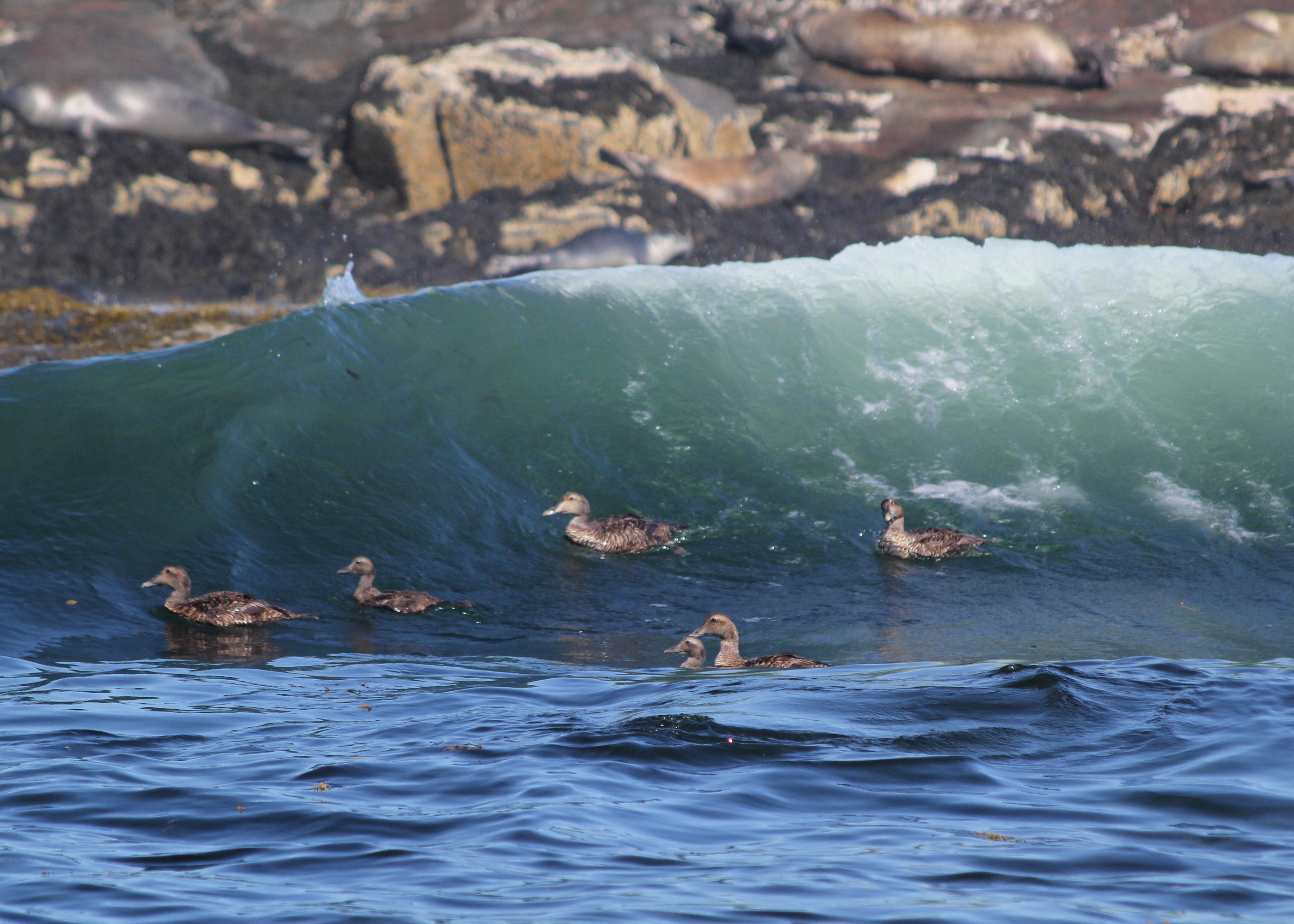 The Common Eiders here seemed perfectly comfortable in the rough water, as they floated over the surf around the island.