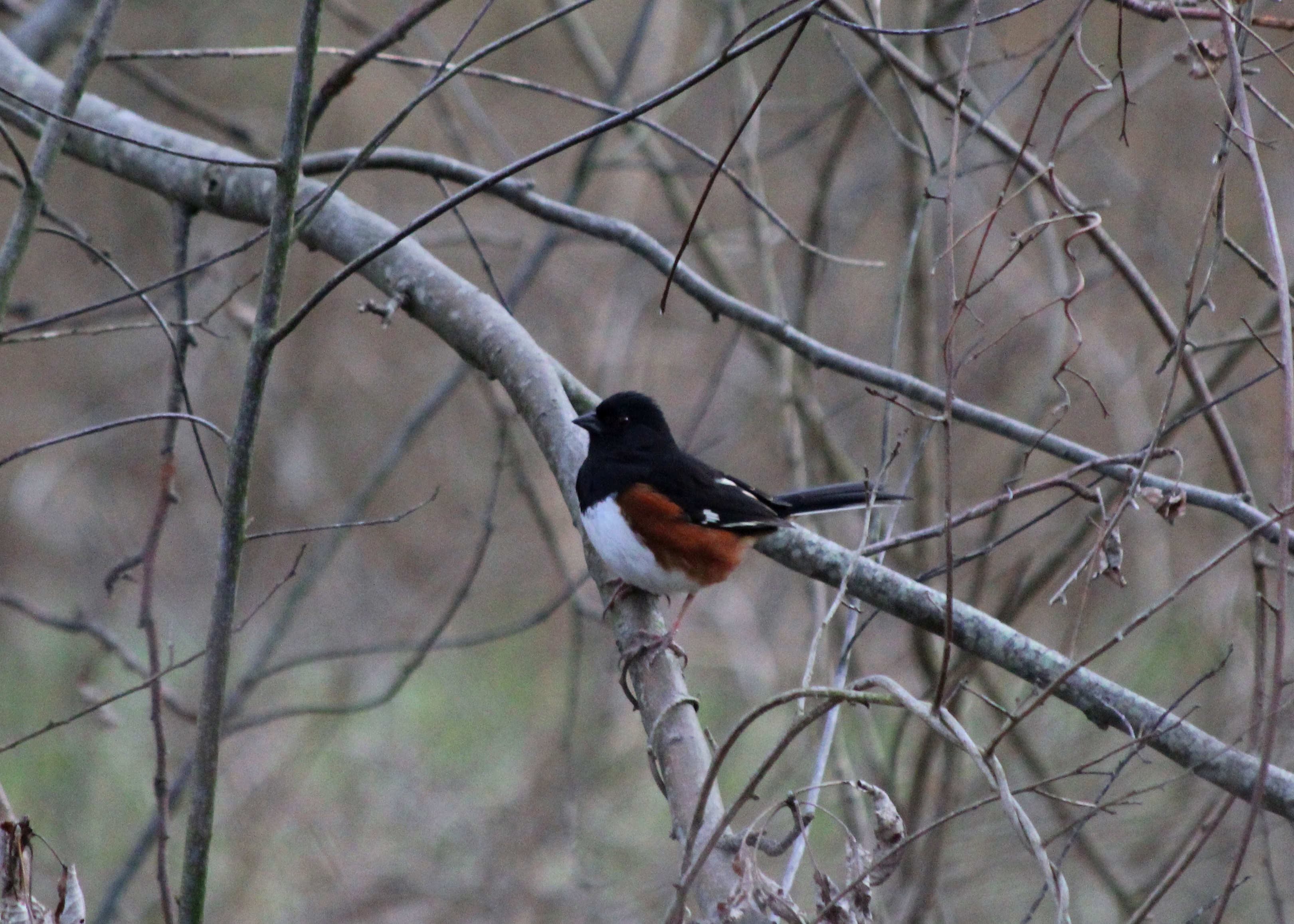 The walk ended with a treat – an Eastern Towhee showing off in plain view. These are beautiful birds, they remind me of a Robin with a stylish new outfit, but they are almost always poking around underneath a giant stick pile, so we don’t usually get a good view.