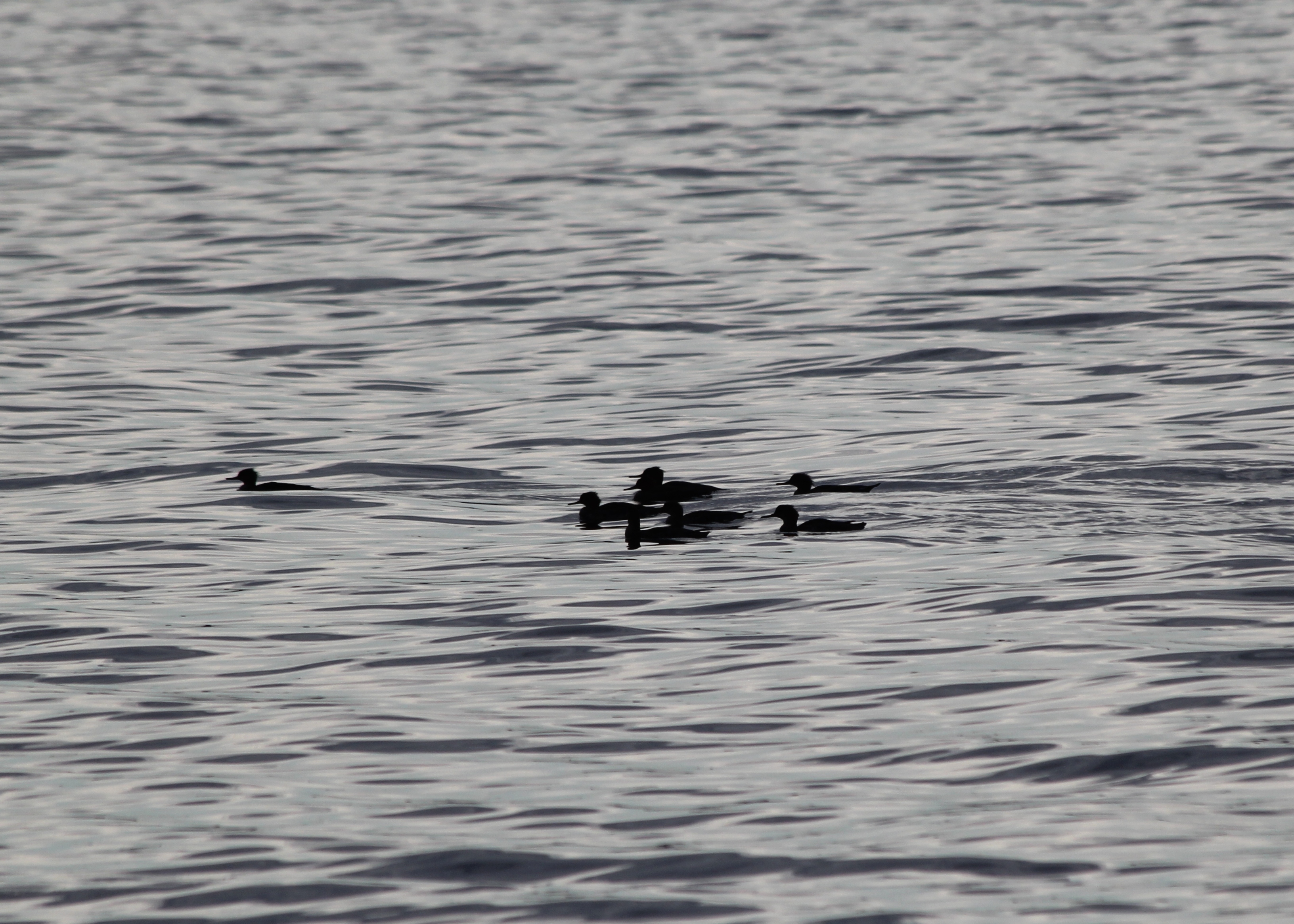 There were a few songbirds along the trail, such as the American Goldfinch, Dark-eyed Junco, White-throated Sparrow and Yellow-rumped Warblers.  Our main objective was to see what was out on the bay, and here we found a number of Horned Grebes and Red-breasted Mergansers, seen in silhouette below with their long, thin bills: