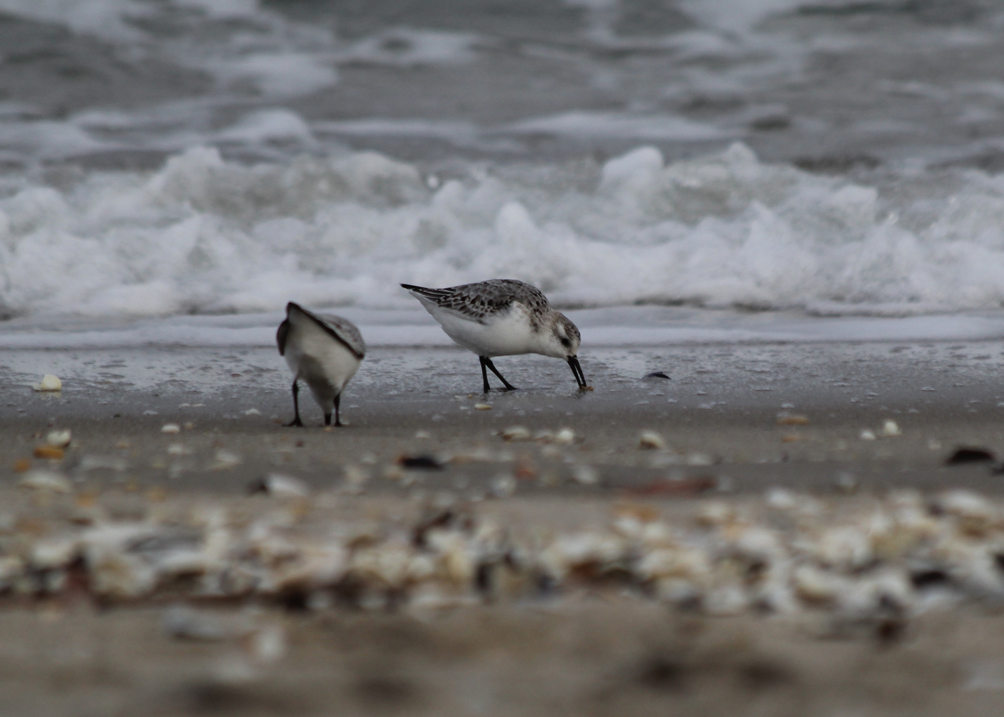 Next we drove to the North Beach, in search of the Northern Gannet, who we hoped to add to our Life List today. Jerry has seen and described the Gannet to us before, but to date they have eluded the Bird Nerds.  We climbed the observation deck near the North Beach parking area, and scanned the massive beach and shoreline.  From here, we saw a large seabird, plummeting into the ocean in search of fish.  It was the Northern Gannet LL we hoped for!  We walked to the water to get a better look, and here we found some adorable Sanderlings snacking and flying along the shoreline: