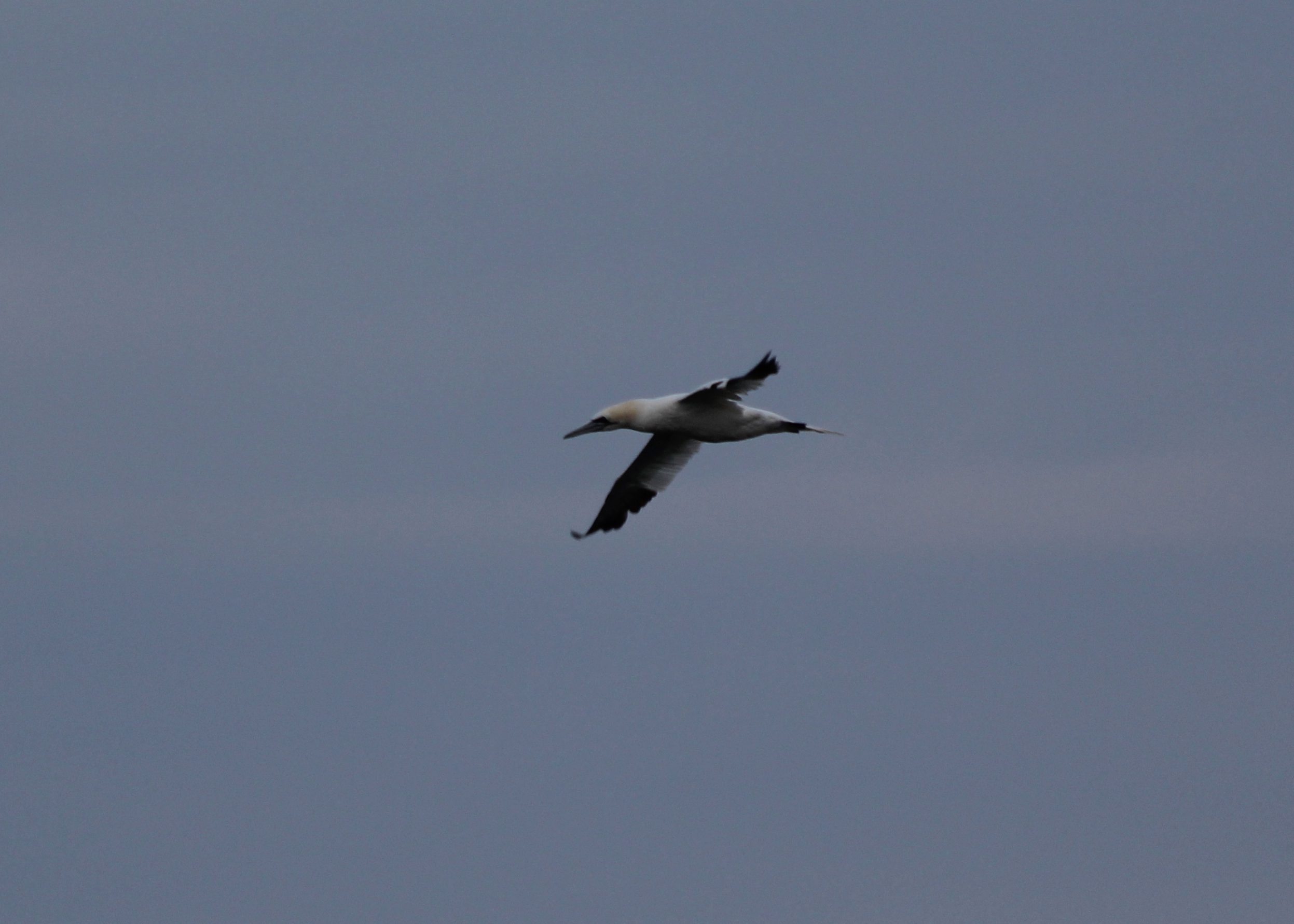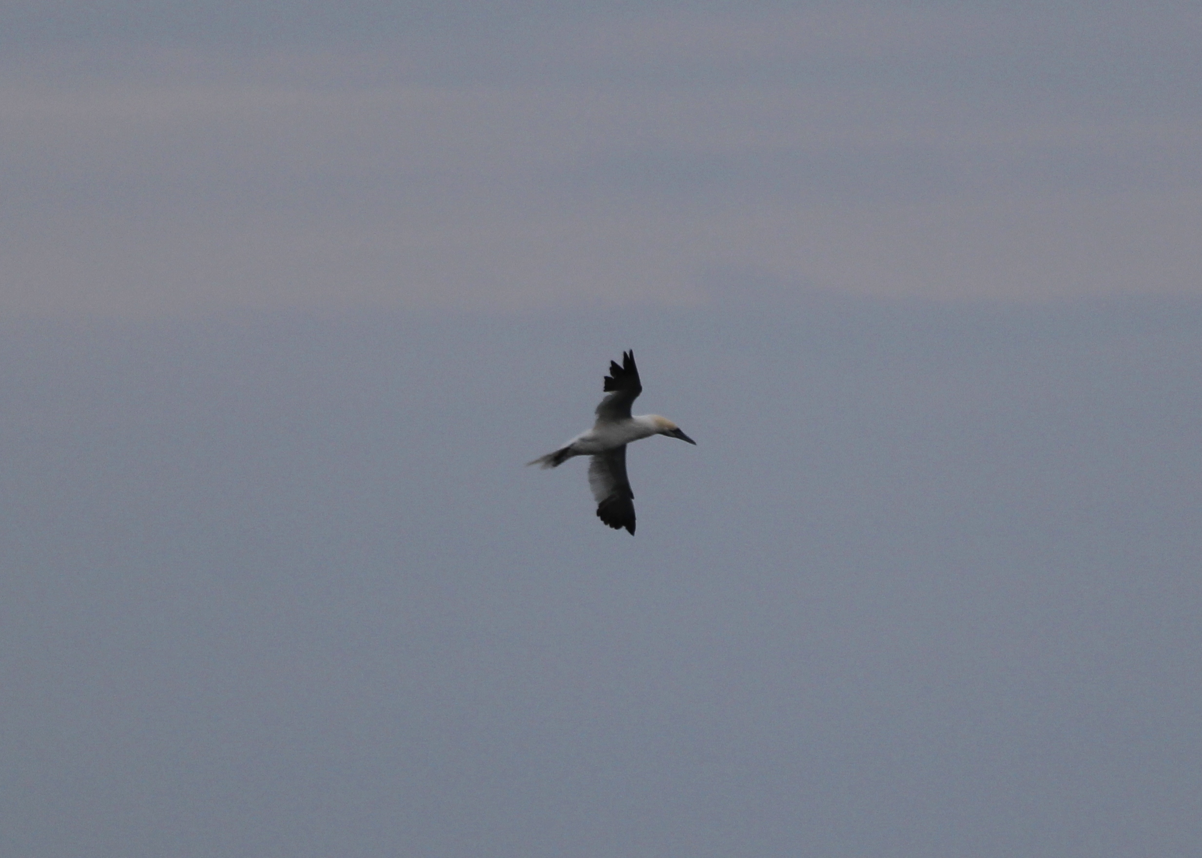 But back to the Gannets.  The Northern Gannet is a special bird.  Although it looks like a gull at first glance, it is actually related to the Booby.  You can distinguish these birds from gulls by their brilliant white coloring and jet black wing tips.  They are also very large, around three feet long with a six foot wingspan.  This bird spends most of its life at sea, only coming to land to breed in large colonies along rocky cliffs.  On our side of the Atlantic Ocean, there are only six established colonies where these bird breed, each along the East Coast of Canada.
